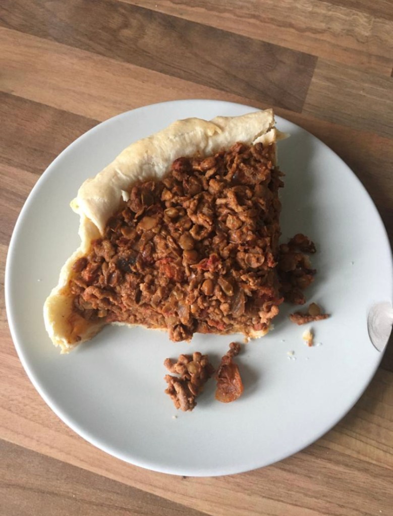 The party is just beginning and more revellers arrive. A can of chopped tomatoes plops into the mix unceremoniously. It has little class but, knowing its usefulness, will never be ashamed of its appearance. Along comes the can of green lentils. It politely waves to everyone as it gently oozes into the pan elevating this gathering to a new social status. Leave them to bubble away under a lid. Allow them time to get to know each other. Twenty minutes or so should be fine. Pastry. I see your confusion but stay with me – it is vital to this dish. Lay it out in the freshly greased pie dish like a tablecloth awaiting its meal. Don’t worry about the edges, perfection is not necessary and who doesn’t like a crunchy crust? This needs a moment alone; it needs to prepare for the delight that is coming. Place it in the heat of the oven with some baking beans to contemplate, adjust, make ready.